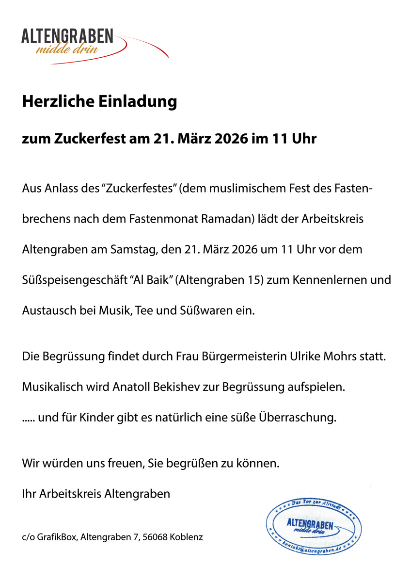 “Zusammenhalt in Vielfalt”: Eröffnung des Zuckerfest im Altengraben Beim “Zuckerfest” im Altengraben kamen auch dieses Jahr Anwohner, Gewerbetreibende und Gäste … Mehr
