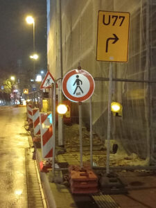 Erst nach Intervention mehrerer anderer Stellen kam im Herbst 2025 Bewegung in das Thema und die Baustellensicherung wurde zum Dezember verbessert. Nunmehr sind endlich die Blinklichter gesetzt, die auch die Fußgänger in der Dunkelheit darauf verweisen, daß der Fußweg hier gesperrt ist! Bleibt nur zu hoffen, daß dies auch berücksichtigt wird.
