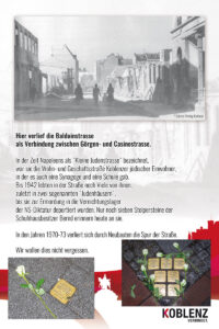 Im Rahmen der Veranstaltungen zum 27. Januar, dem Gedenktag für die Opfer des Nationalsozialismus, gedachte die Bürgerinitiative “Unsere Altstadt” an der “Informationsstele der ehemaligen Balduinstraße” der Opfer von Tyrannei und Menschenverachtung in der Koblenzer Altstadt. Die BI unterstrich dabei die Bedeutung von “generationsübergreifender Erinnerungskultur” und die Sichtbarkeit der Erinnerung im öffentlichen Raum. Hierzu zählen nicht nur die Stolpersteine (in der Altstadt sind derzeit 23 für jüdische Mitbürger und 4 für weitere Opfer des Nationalsozialismus in die Gehwege eingelassen), sondern auch — zumeist auf private Initativen zurückzuführende — Informations- und Gedenktafeln. So auch die Stele an der ehemaligen Balduinstraße.