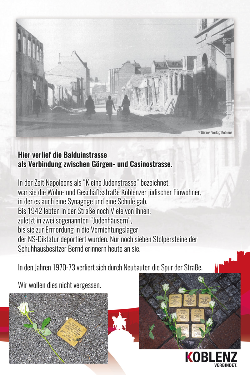 Im Rahmen der Veranstaltungen zum 27. Januar, dem Gedenktag für die Opfer des Nationalsozialismus, gedachte die Bürgerinitiative “Unsere Altstadt” an der “Informationsstele der ehemaligen Balduinstraße” der Opfer von Tyrannei und Menschenverachtung in der Koblenzer Altstadt. Die BI unterstrich dabei die Bedeutung von “generationsübergreifender Erinnerungskultur” und die Sichtbarkeit der Erinnerung im öffentlichen Raum. Hierzu zählen nicht nur die Stolpersteine (in der Altstadt sind derzeit 23 für jüdische Mitbürger und 4 für weitere Opfer des Nationalsozialismus in die Gehwege eingelassen), sondern auch — zumeist auf private Initativen zurückzuführende — Informations- und Gedenktafeln. So auch die Stele an der ehemaligen Balduinstraße.