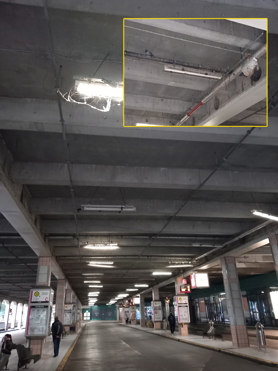 Wer im Bus­bahn­hof Löhr­Cen­ter ankommt oder auf eine Ver­bin­dung war­tet darf kei­nes­falls nach oben schau­en. Hier trifft Tau­ben­kot auf Spin­nen­ge­we­be und Staub­wol­ken. Und dies vor den Augen der Ser­vice­mit­ar­bei­ter des dor­ti­gen Infor­ma­ti­ons­bü­ro. Was nützt alles Mühen um eine attrak­ti­ve Innen­stadt, wenn ankom­men­de oder abfah­ren­de Kun­den hier unter unan­sehn­lich und ver­schmutz­ten Bus­termi­nals sich bewe­gen sol­len. Das dies sich auch auf die zum Teil beschä­dig­ten Sitz­bän­ke bezieht, ist sicher­lich sekun­där. Das aber beschä­dig­te Bord­stein­kan­ten sowie die Lam­pen, die sich teil­wei­se aus der Befes­ti­gung gelöst haben, eine Unfall­quel­le bedeu­ten, muss als gra­vie­ren­der ange­se­hen wer­den.