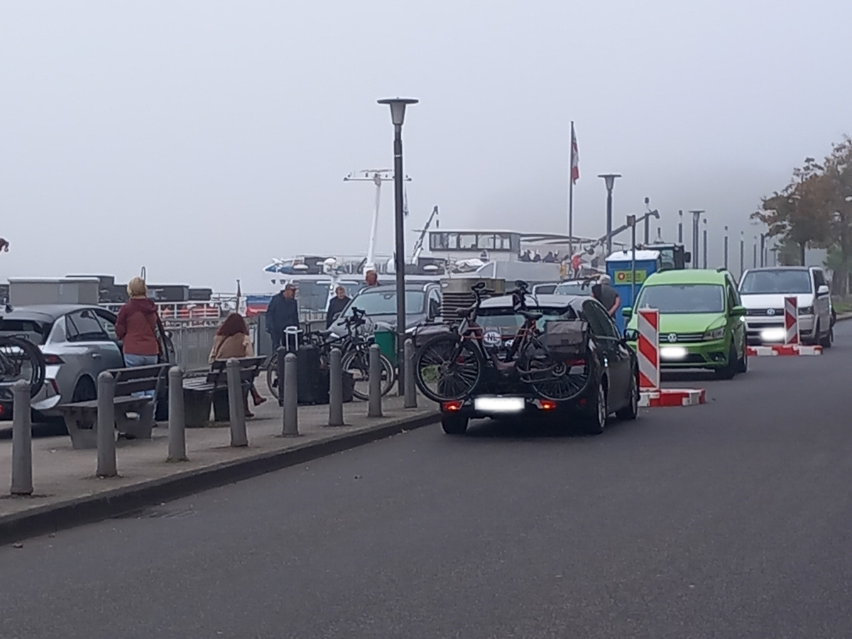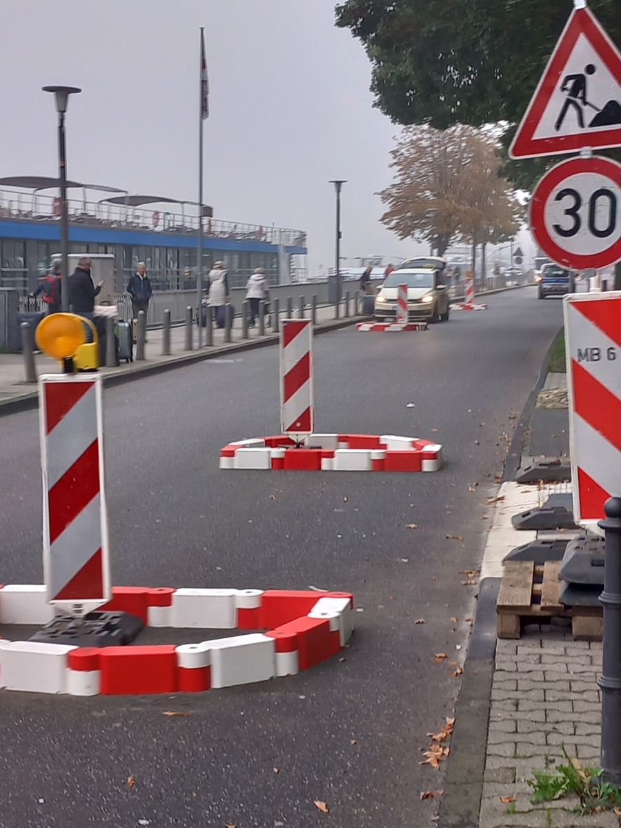 Was für eine Idee, durch kleine Verkehrsinseln das Peter-Altmeier-Ufer zu entschleunigen und für Poser unattraktiv zu machen. Jedoch zeigte sich, dass es immer wieder auch zwei Seiten einer Medaille gibt. Zum einen wurden die Lücken der Verkehrsinseln am Sonntagmorgen als Be- und Entladebuchten zum Bettentausch der Flusskreuzfahrtschiffe entsprechend genutzt oder dienten als Taxibuchten. Selbst der Promenadenfußweg wurde zugeparkt! Es zeigt sich auch hier, dass die Nutzungsvereinbarung für die Hotelschiffe einer Novellierung bedarf.